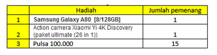 * Hadiah tidak dapat diuangkan. Apabila pemenang tidak bisa mengambil hadiah, maka hadiah dianggap hangus.
